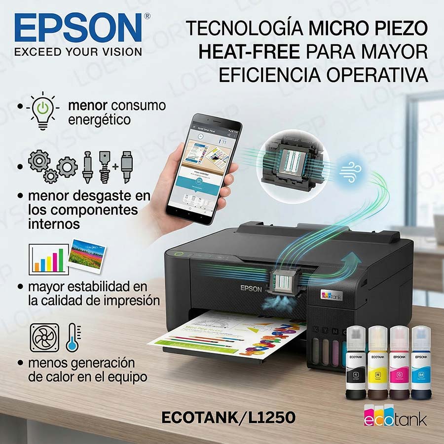 Uno de los principales atributos del modelo L1250 es su sistema de tanque de tinta recargable EcoTank, que elimina el uso de cartuchos tradicionales.
