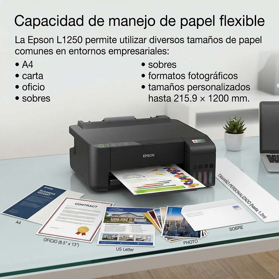 La Epson EcoTank L1250 ofrece una resolución máxima de impresión de hasta 5760 × 1440 dpi, lo que permite producir documentos con texto nítido y gráficos detallados.