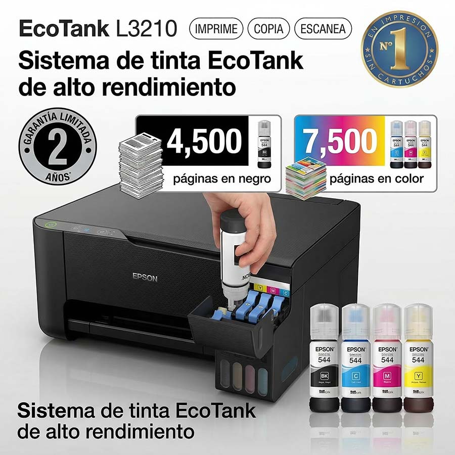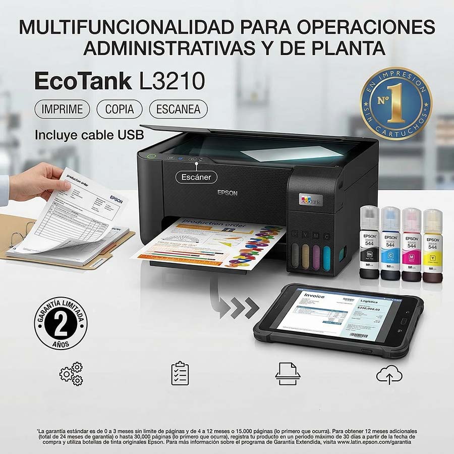 Una de las principales ventajas de la Epson EcoTank L3210 es su capacidad multifuncional, ya que integra impresión, escaneo y copiado en un solo equipo. Esta característica permite centralizar tareas documentales en áreas donde se generan grandes volúmenes de documentos operativos.