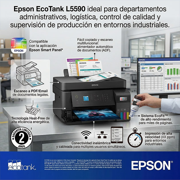 La Epson EcoTank L5590 representa una solución de impresión eficiente para empresas manufactureras que requieren un flujo constante de documentos administrativos y técnicos.