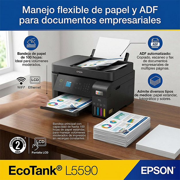 La Epson EcoTank L5590 es un equipo multifuncional 4-en-1, capaz de realizar: