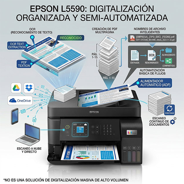 Sí —pero con matices importantes—: la Epson EcoTank L5590 sí puede funcionar como herramienta de digitalización documental organizada, incluso con cierto nivel de automatización, pero NO es un escáner masivo profesional dedicado como los de alto volumen (tipo escáneres de alimentación continua industrial).